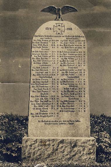 Die Inschrift lautet: Ihr Andenken werden wir stets in Ehren halten. Die Namen von 53 Lubbener Gefallenen sind gut zu lesen. |